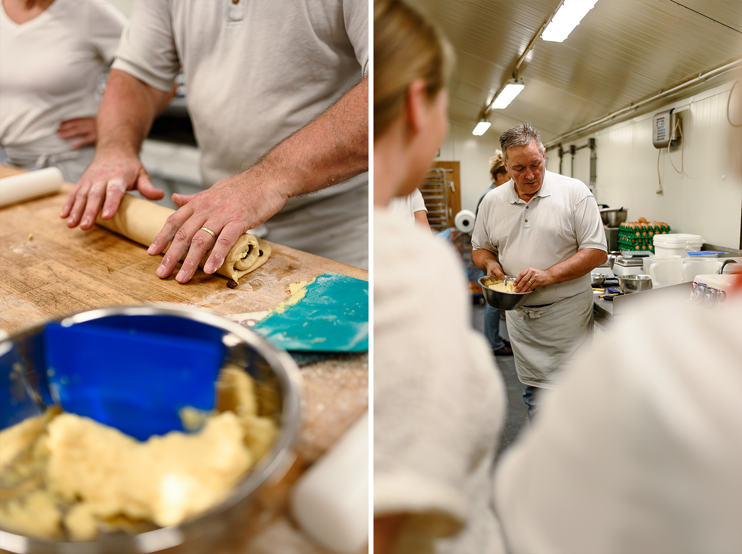 Na de lunch is het tijd voor de brioche en focaccia. Het briochedeeg voelt compleet anders aan dan het brooddeeg van eerder. Door de flinke hoeveelheid roomboter is het zijdezacht geworden. Jan laat zien hoe we het deeg moeten vouwen en kneden om de structuur te versterken. Hij legt ook uit hoe belangrijk de verhouding tussen bloem en vetten is bij het bakken van dit soort luxe broden. Voor de vulling van de brioche gebruiken we banketbakkersroom, cranberries, rozijnen en een snuf kaneel. De geur van de specerijen vult de ruimte, en het is meteen duidelijk waar die kruidige geur vandaan komt die we eerder al roken. Het deeg wordt opgerold, in plakken gesneden en in bakvormen gelegd.