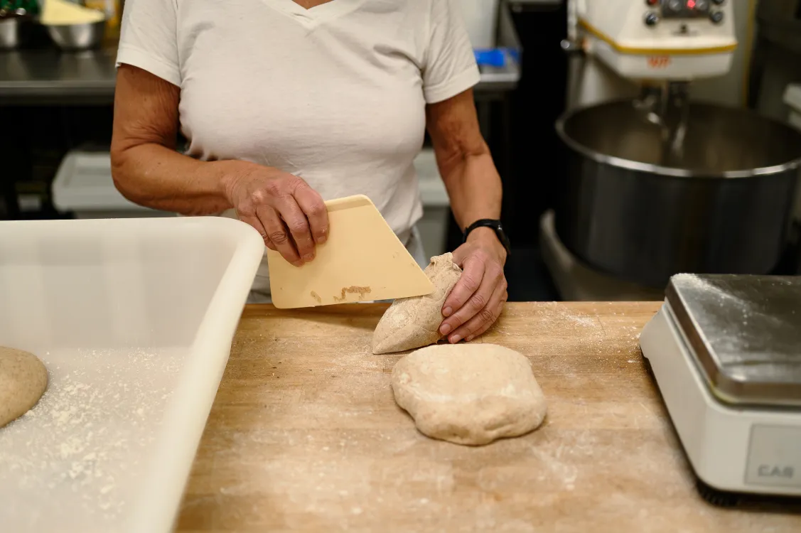 Dan is het tijd om zelf aan de slag te gaan. Het eerste deeg maken we volledig met de hand. In een beslagkom mengen we bloem en gist voorzichtig met onze vingertoppen. Daarna begint het echte werk: kneden. Dit doen we op een houten werkblad, dat niet alleen prettig werkt, maar ook helpt om de temperatuur van het deeg stabiel te houden.