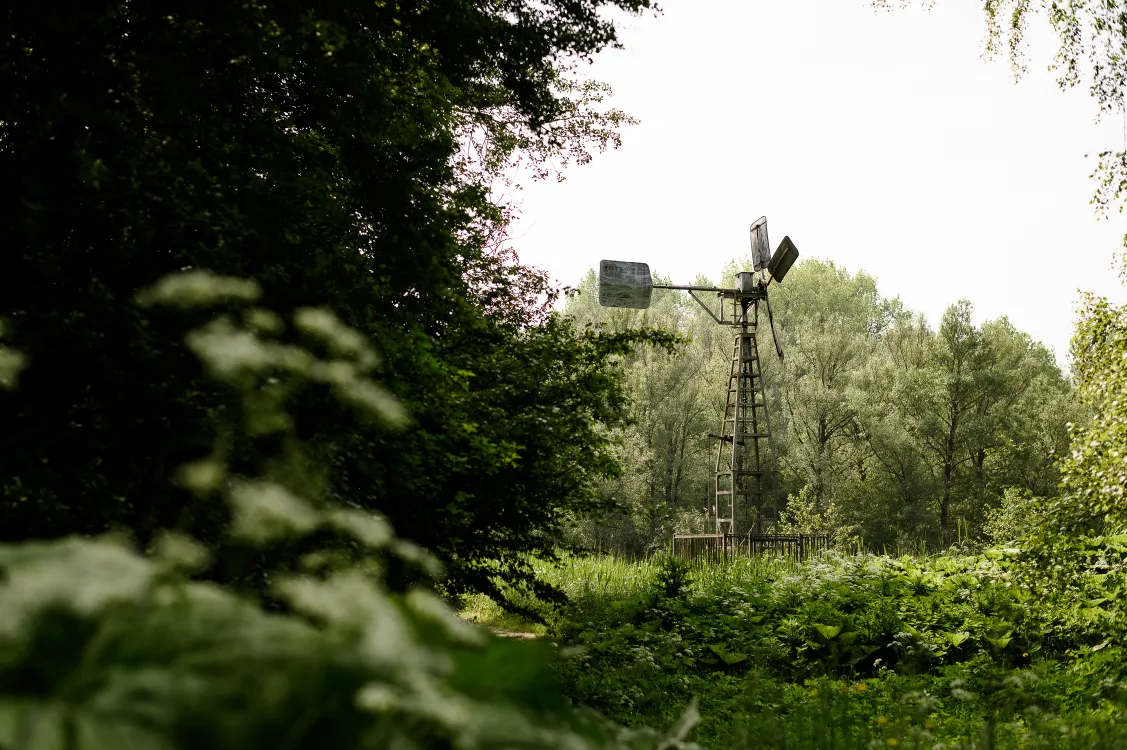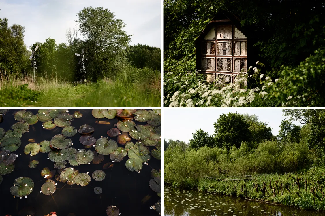 Midden in al het water ligt een natuurtuin verscholen. Als een soort eilandje verborgen door het groen. De natuurtuin is 1,5 hectare groot en van origine aangelegd om landschappen van vroeger weer te geven. De ingang is moeiteloos te vinden en wandel de heemtuin in. Er zijn verschillende paden te volgen die langs de verschillende miniatuur landschappen voeren. Ik passeer een moerasachtig gedeelte, akkers, een fruitboomgaard met een heerlijk bankje eronder en een griend. Door het griendgedeelte is een vlonderpad aangelegd zodat je op gelijke hoogte van de boomkruinen kunt lopen. Ook hier is onze connectie met het water terug te vinden. Smalle slootjes stromen uit in een grotere poel waar je de vissen kunt zien zwemmen onder de wateroppervlakte. Twee karakteristieke windmolens zorgen ervoor dat het waterbeheer op orde blijft.