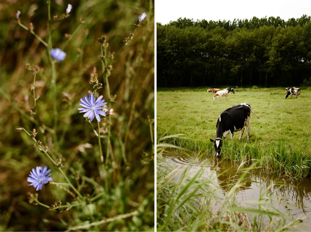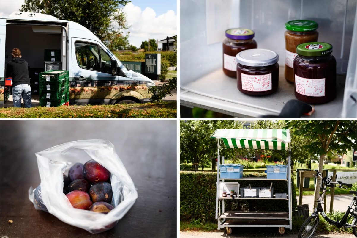 Mocht je nu denken, pfoe ik ben toe aan een kop koffie voor ik verder ga, dan is daar om de hoek café Du Midi. Een knus café met een heerlijk terras. Ik besluit om een stop te maken om de route goed te bekijken voordat ik verder fiets. De koffie wordt geserveerd en het is er rustig genoeg om de beschrijving op mijn gemak door te nemen. Na een toiletstop, ook niet onbelangrijk, fiets ik verder langs het Bieslandse Bos. De naam is hier een beetje misleidend, want ik heb voornamelijk zicht op de landerijen van Hoeve Biesland. De zon werkt goed mee vandaag en zet de polders in een mooi licht. De volgende horeca gelegenheid dient zich aan, aan de overkant van de weg zit de Balije Tuin. Ik stap af om even te kijken bij het kraampje aan de weg waar fruit en noten uit eigen boomgaard te koop liggen. Het geld kun je in het kistje stoppen. Net als ik weg wil gaan komt er een busje aangereden van Hoeve Biesland. Ik raak aan de praat met de chauffeur. Hij komt versproducten afleveren bij de Balije Tuin. Dit is zo mooi om te zien! De boerderij is bijna te zien vanaf hier. Knap staaltje kopen in de korte keten. Ik besluit om op de terugweg te lunchen bij de Balije Tuin, maar nu weer op mijn stalen ros te stappen.