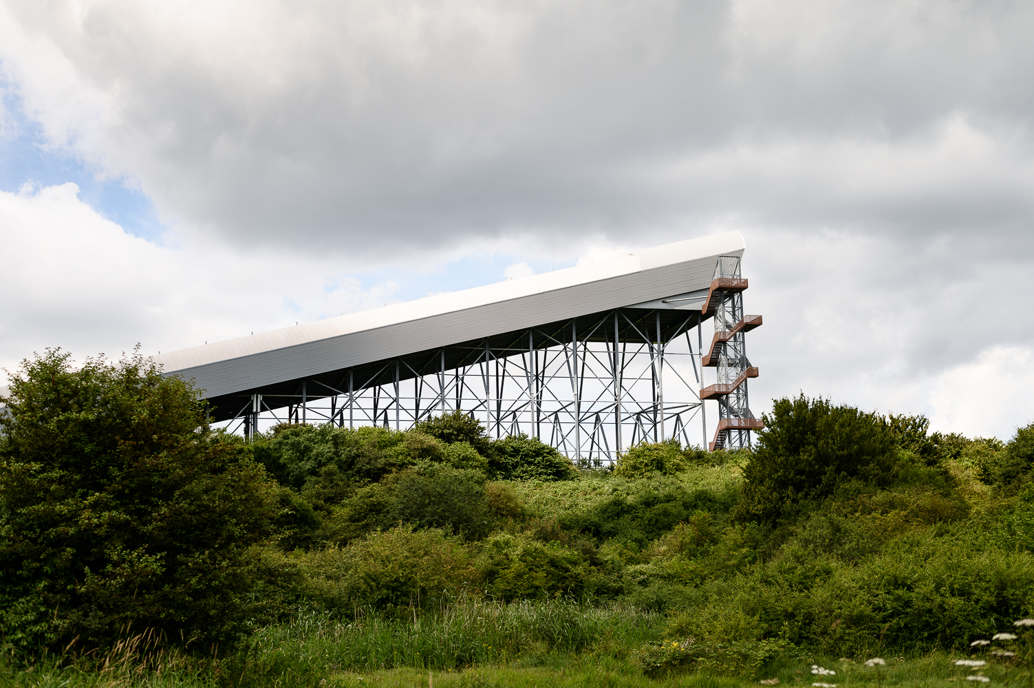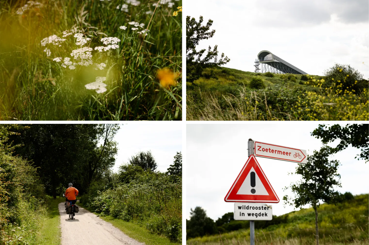 Over het Westerpark heb ik al eerder geschreven. Een mooi park aan de rand van Zoetermeer met in het midden een verborgen natuurtuin. Ook nu ik hier fiets valt mij weer op hoe hoog de bomen zijn en hoe groen het bladerdak. Zo anders dan het open polderlandschap van zojuist. Ik zie veel mensen hier genieten van het groen. Vissers zitten met hun tentje langs een meertje en een verliefd stelletje zit op een bankje. Via een tunneltje verlaat ik het Westerpark om deze in te ruilen voor het Buytenpark. Ook een park, maar heel anders. Op iedere hoek wordt het uitzicht gedomineerd door een hoog bouwwerk wat rust op een stalen stellage. Kun je raden wat het is? Ik kijk hier naar Snowworld! Daar binnen suizen fervente wintersporters in hartje zomer op de lange latten naar beneden. Het contrast tussen de seizoenen kan niet groter zijn. Aan de voorzijde is een grote trap bevestigd waarmee je naar een uitkijkpunt kunt klimmen. Ik hou het vandaag wel bij mijn fiets, spannend genoeg.