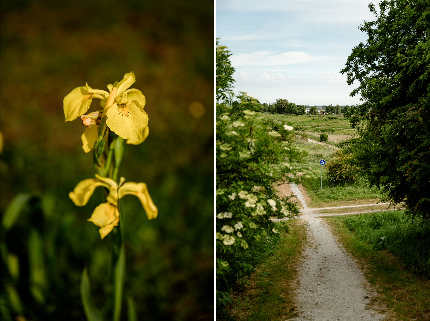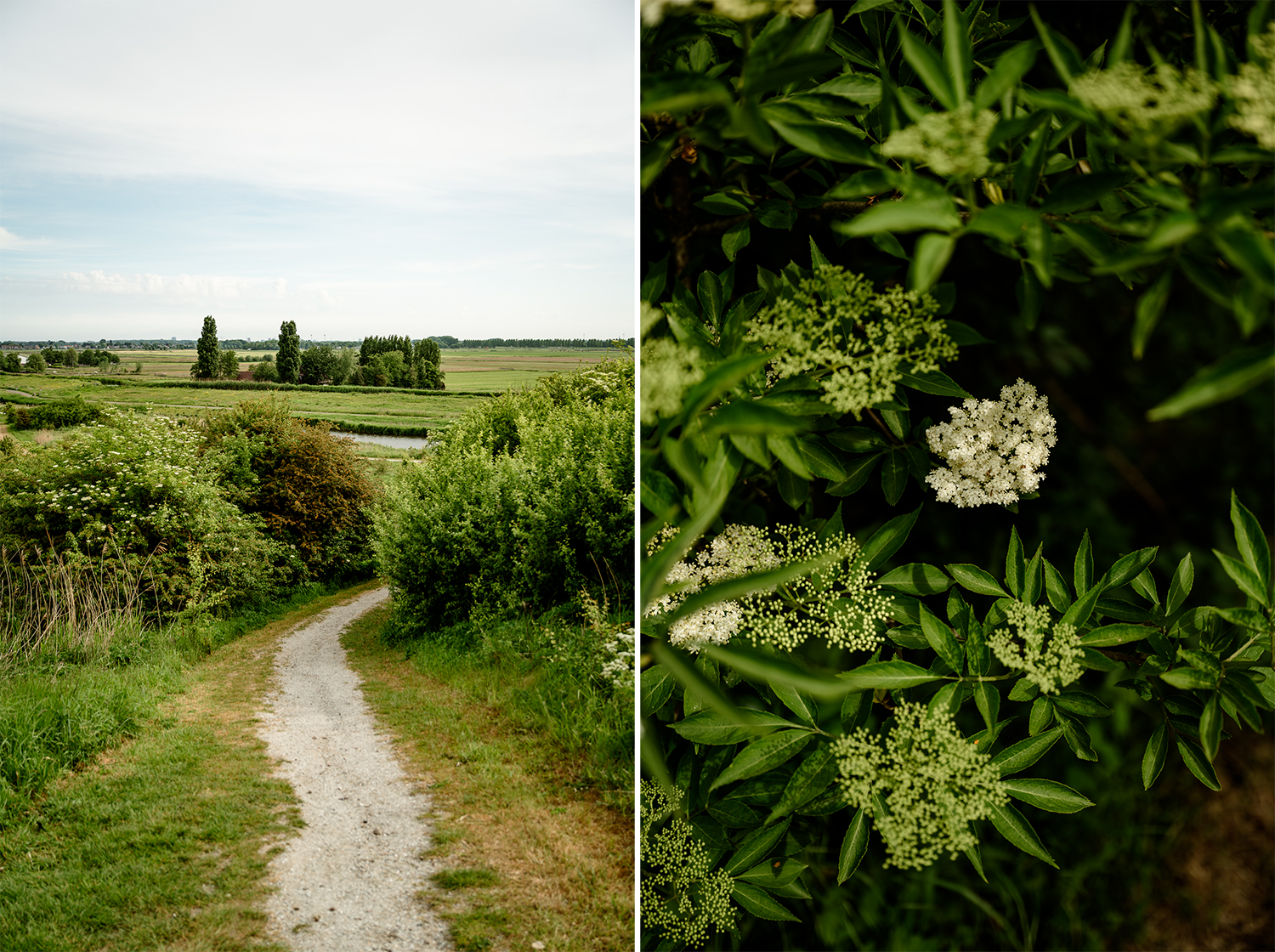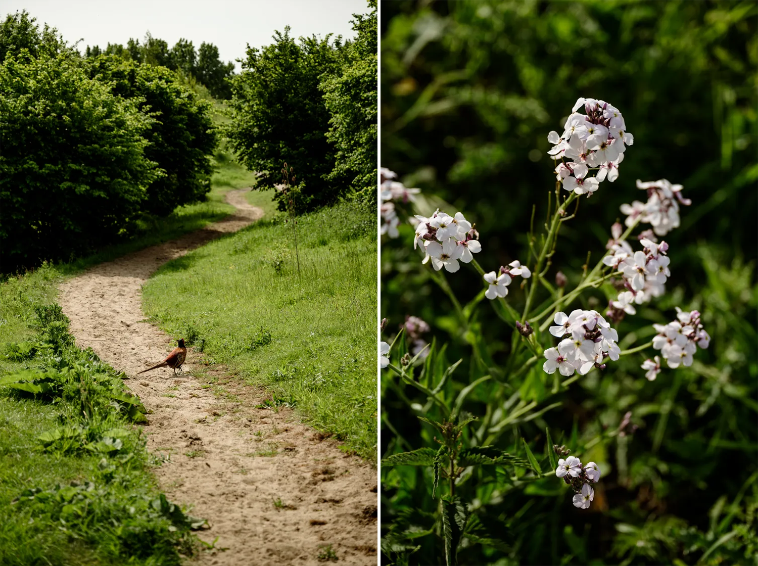 Het is mei, de natuur barst uit haar voegen. Vlierstruiken tonen hun witte bloemtrossen, wilde rozen bloeien uitbundig en hommels en bijen hebben duidelijk een drukke ochtenddienst. In het hoge gras zie ik zelfs een clubje damastbloemen staan. Heerlijk kneuterig, maar ik word er oprecht blij van.