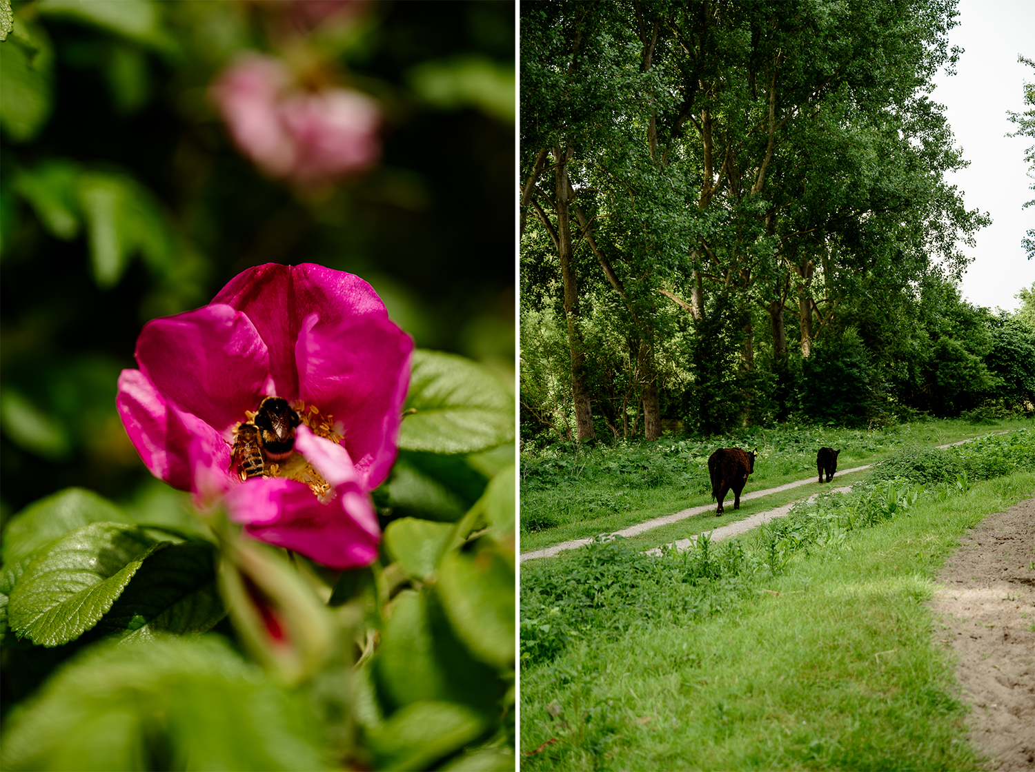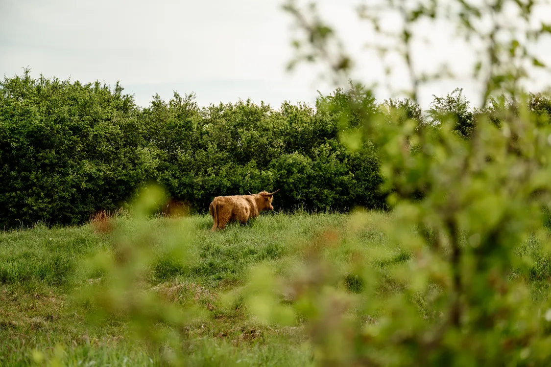 Ik loop door een bebost stukje als ik geritsel hoor. En jawel, daar zijn ze weer: runderen op mijn pad. Dit keer galloways – kleiner dan de hooglanders, maar nog steeds geen dieren waar je even nonchalant langs slentert. Ik neem een omtrekkende beweging. Eén van de dieren blijkt een kalfje te zijn, gitzwart en met een nieuwsgierige blik in de ogen. Het stuitert door het gras alsof het net ontdekt heeft dat poten ook kunnen rennen. Prachtig.