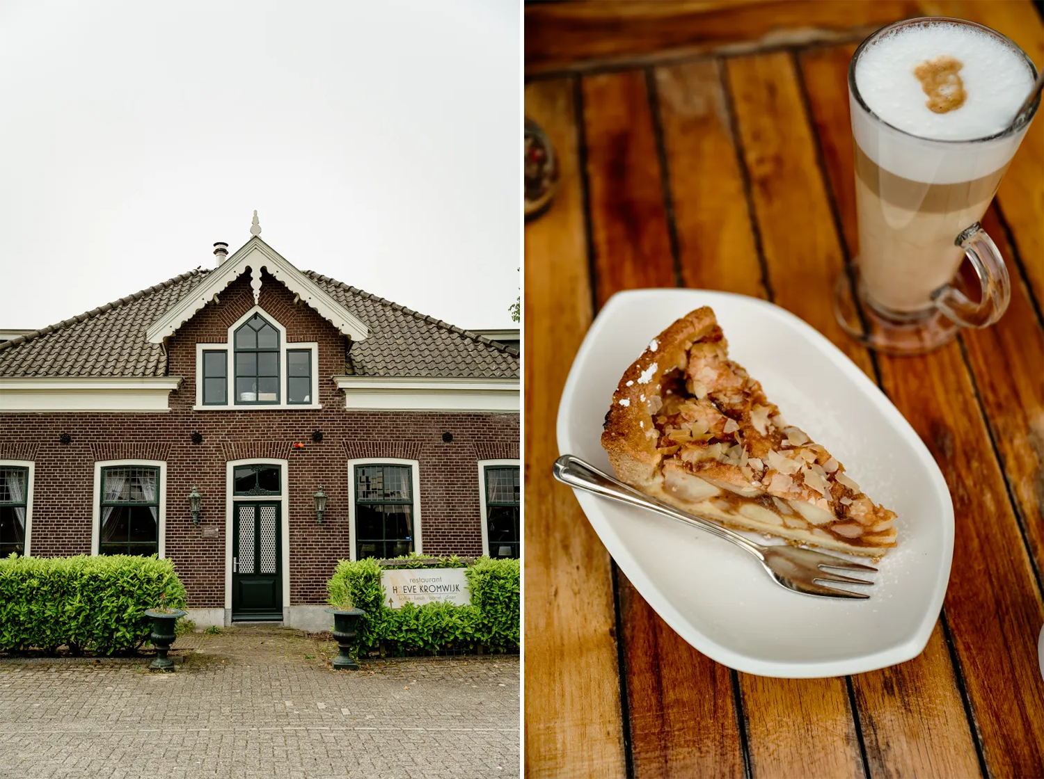 Na een paar uur buitenlucht begint mijn maag te knorren. Gelukkig had ik het slim gepland: mijn wandelronde eindigt bij restaurant Hoeve Kromwijk. Deze monumentale boerderij uit 1871 ging tijdens een nieuwjaarsnacht eind jaren negentig bijna helemaal in vlammen op. Vijf jaar restaureren later opende hier een restaurant dat de charme van toen heeft behouden.