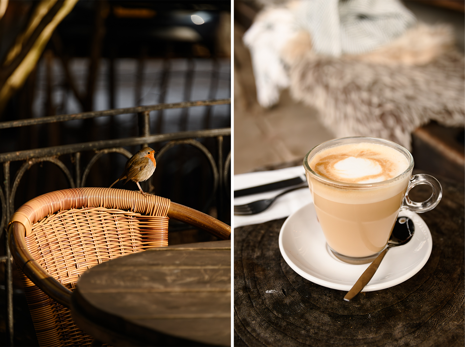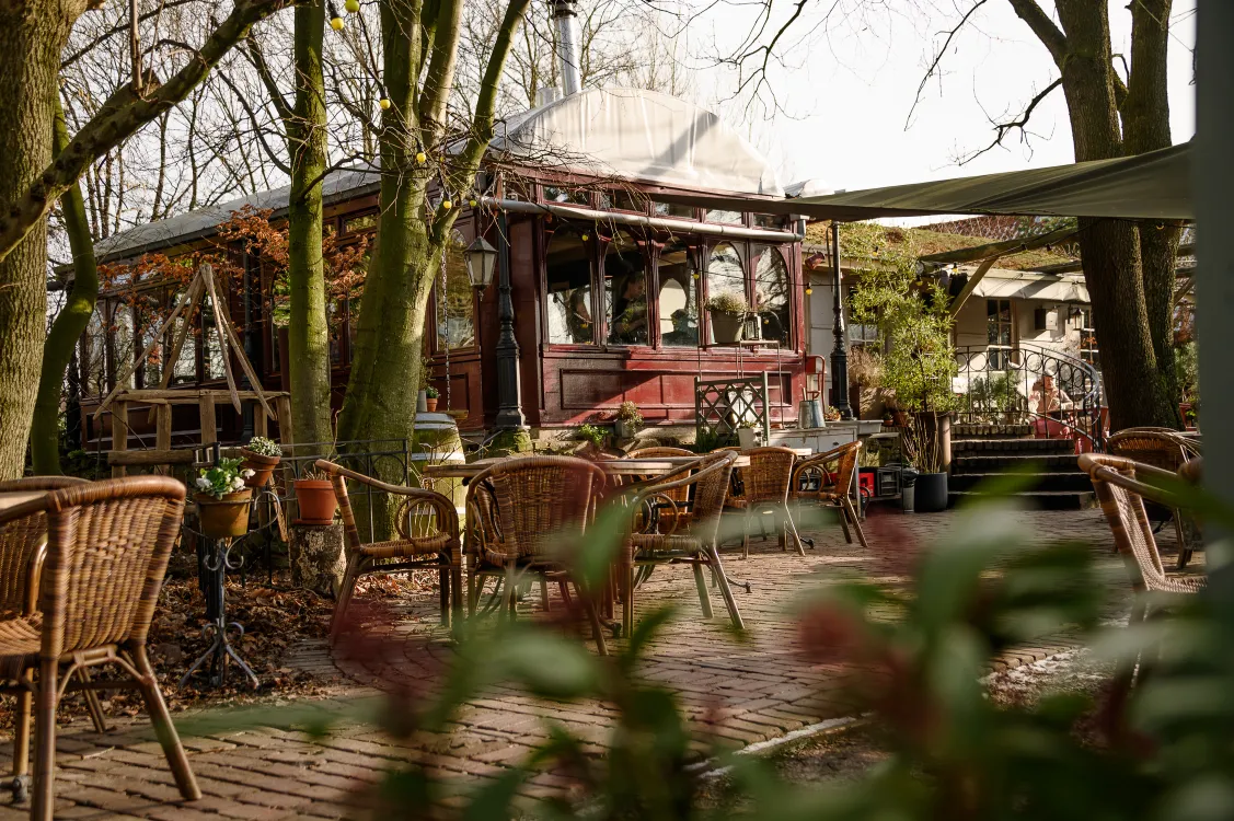 Er klinkt een gezellig geroezemoes als ik over de drempel stap van Café du Midi. Alle tafeltjes zijn bezet, ik mag wachten als ik dat wil. Maar buiten in het zonnetje op het terras is het net zo lekker! Er liggen warme dekens klaar en de koffie wordt heet geserveerd. Kort daarop volgt een bord met kroketten en twee dikke plakken granenbrood. De kroketten zijn afkomstig van Hoeve Biesland en gaan er wel in na deze wandeling. Een brutaal roodborstje heeft het voorzien op mijn brood. Absoluut niet schuw landt hij op mijn bord en doet verwoede poging om er wat vanaf te pikken. Na hem wat graantjes toegeschoven te hebben gaat hij verder bedelen bij de buren die een heerlijk stuk appeltaart voor hun neus hebben staan. Dit café ligt op de helft van de route, maar je komt er ook aan het einde langs. De ideale plek voor een winterse lunch of borrel!